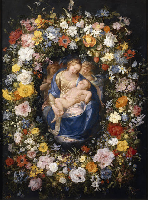 de même qu'un autre flamand Franz Francken, qui a collaboré avec Brueghel pour une Adoration des mages , entourée elle aussi d'une guirlande de fleurs