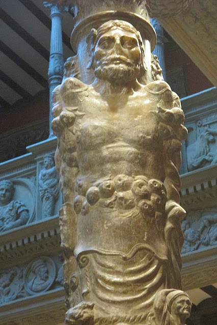des colonnes cariatides en albâtre à trois figures humaines enlacées entre elles,